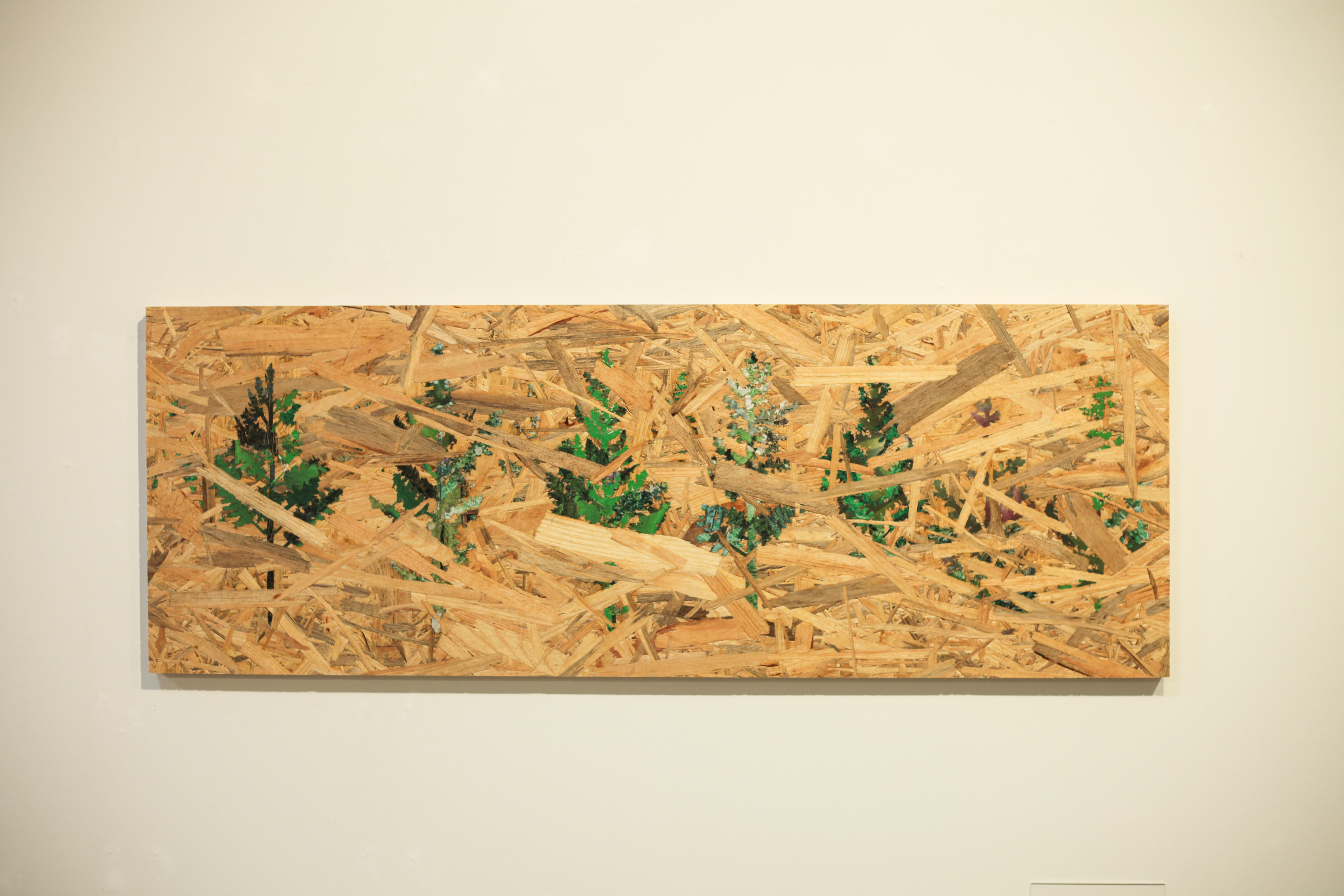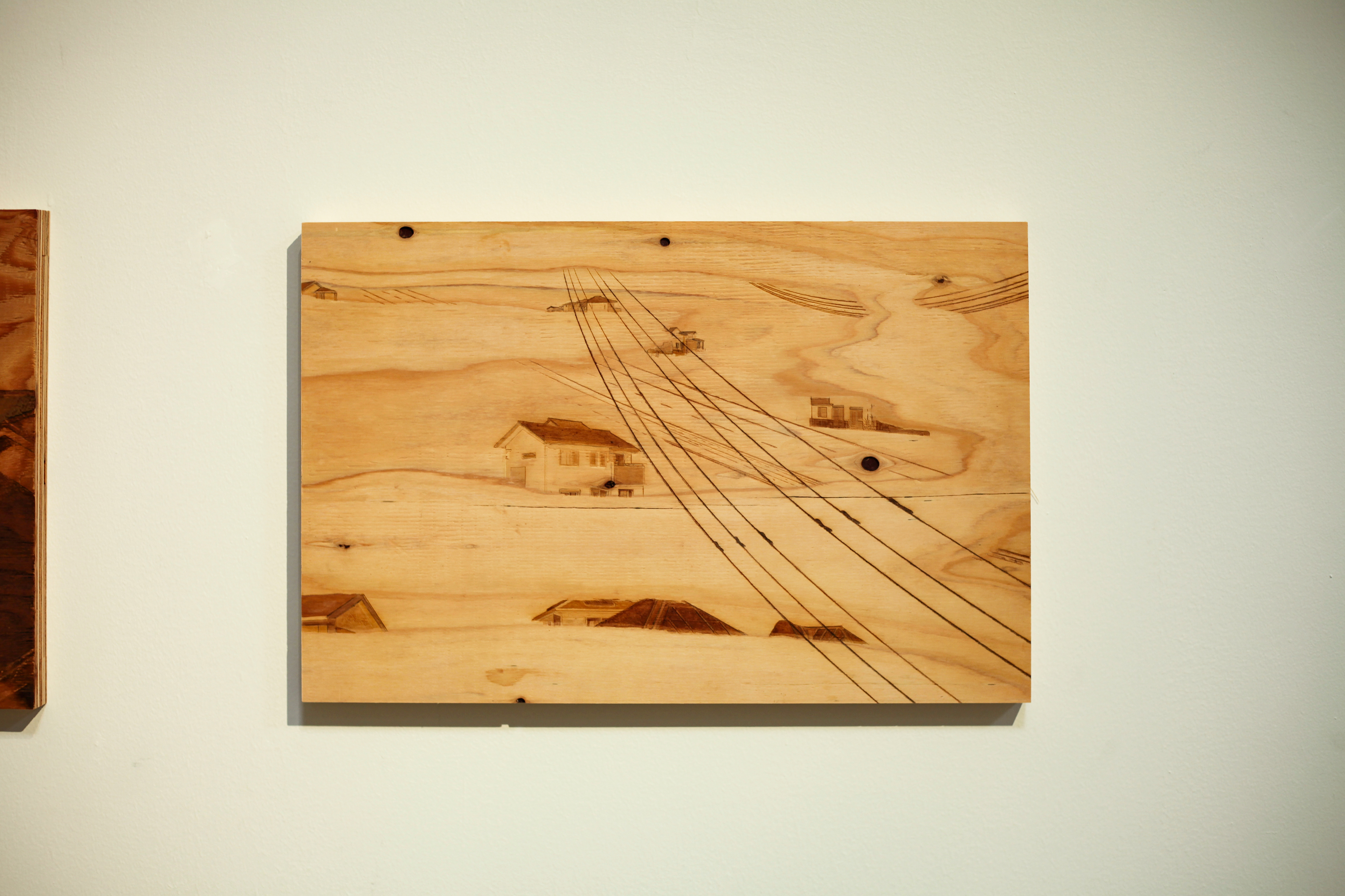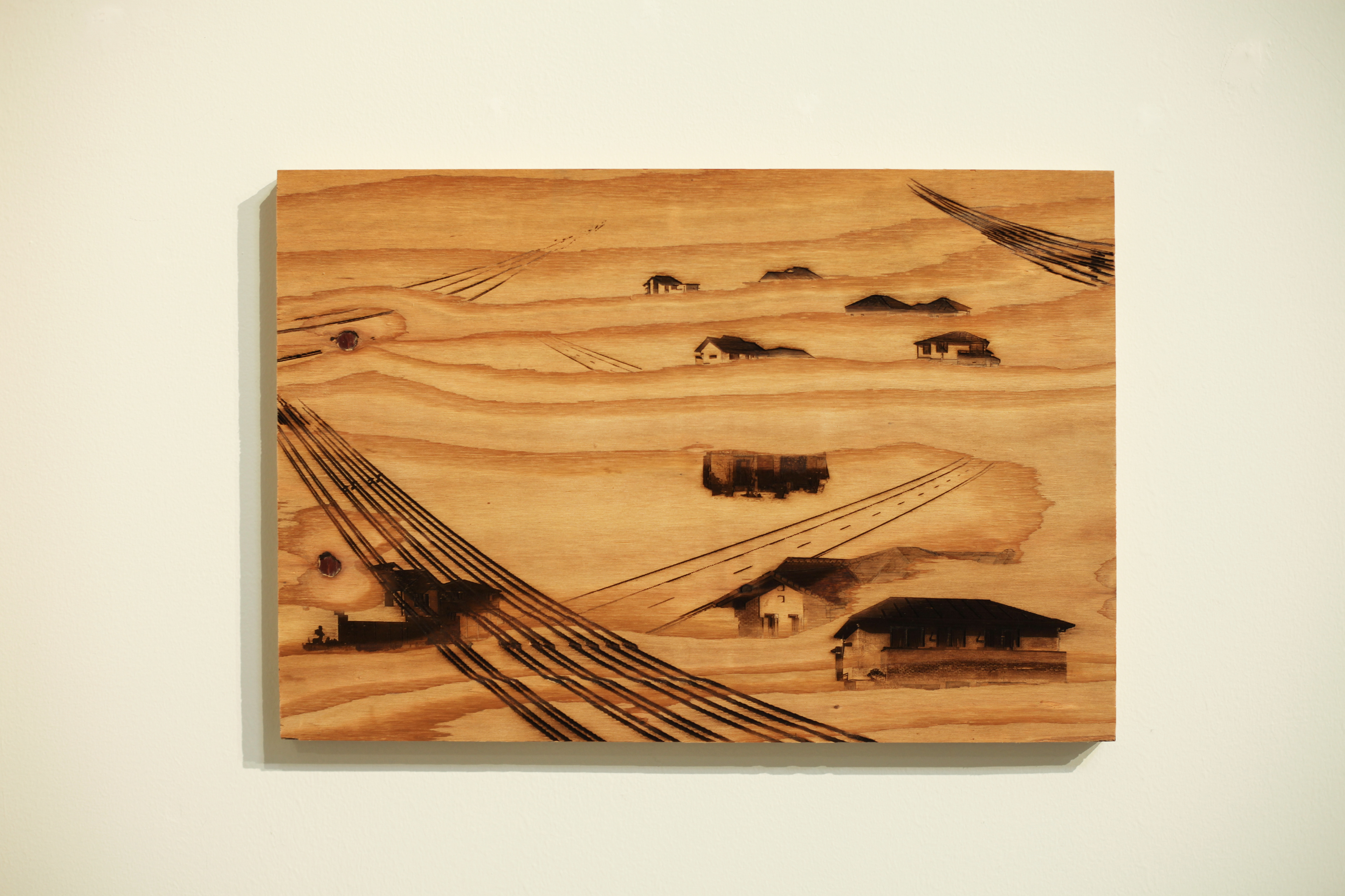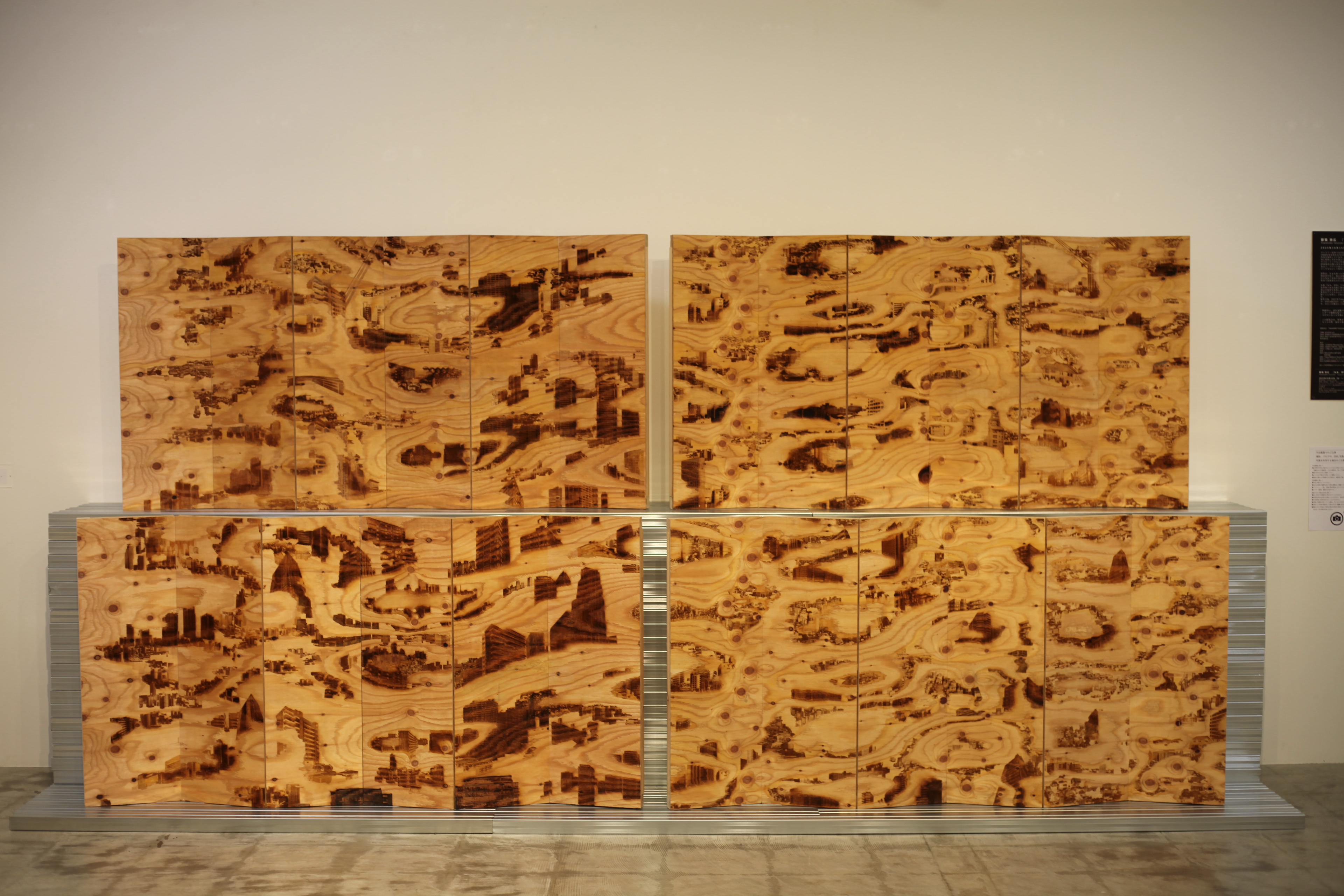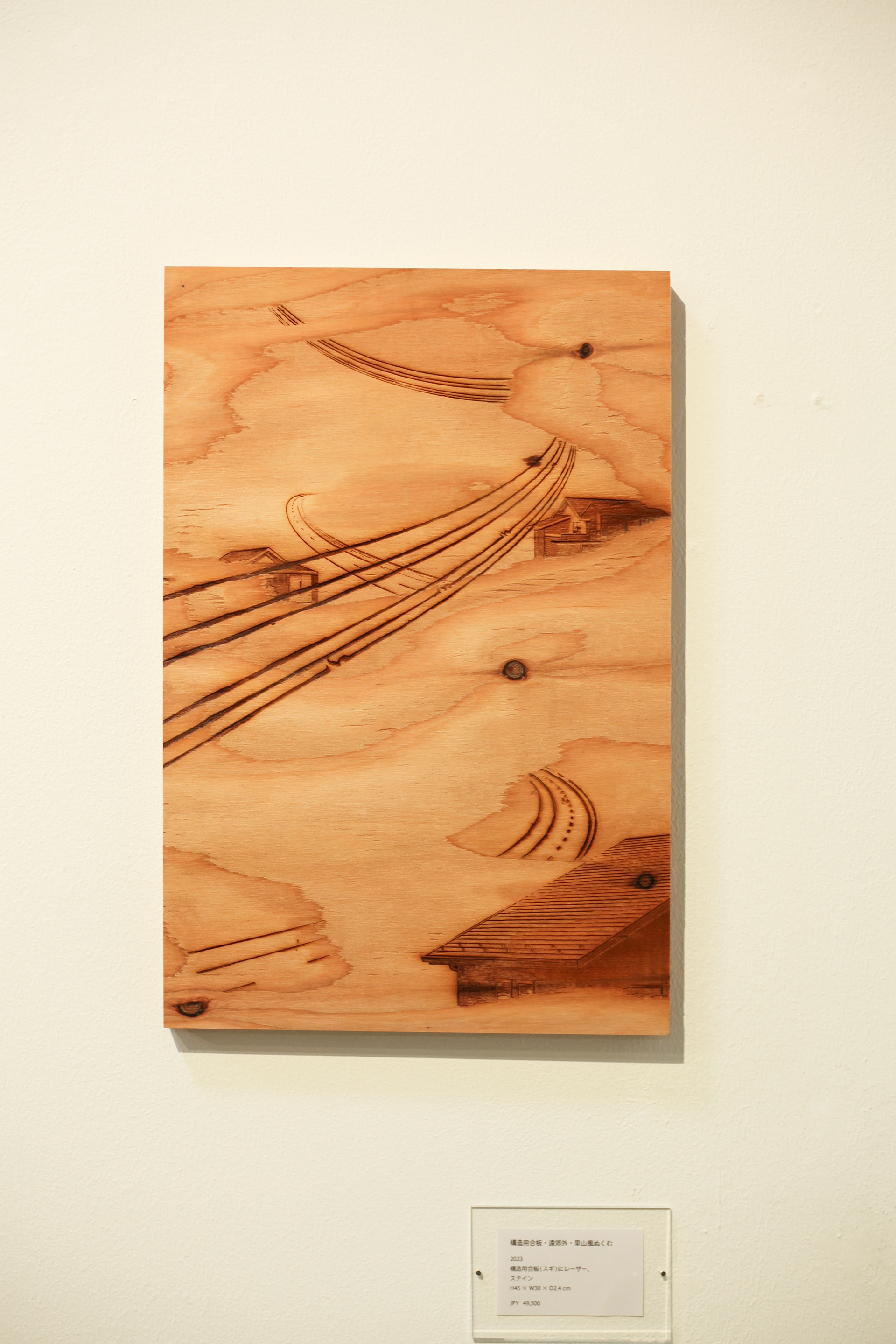 電線、線路、道路と線が続く限り、経済圏はどこまでも続くことを感じます。それと同時においしい空気と野山に癒される、そんな風景を構造用合板に重ねています。規格製品による大量生産型の街と自然の関係を、制御・加工された自然物である合板に重ねてきた「合板都市シリーズ」、その延長に「郊外、その先へ」と続く遠郊外や里山の風景を表現します。